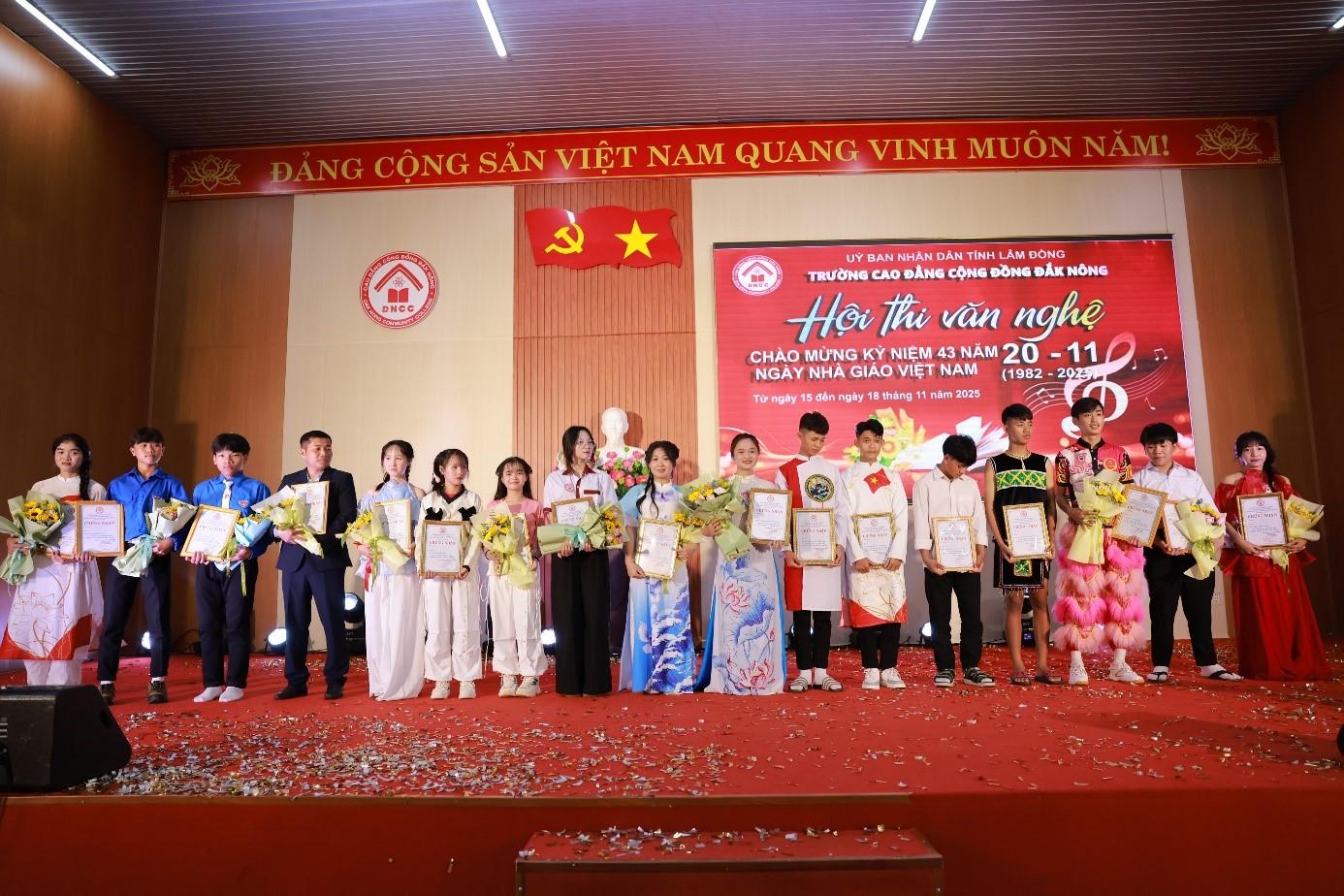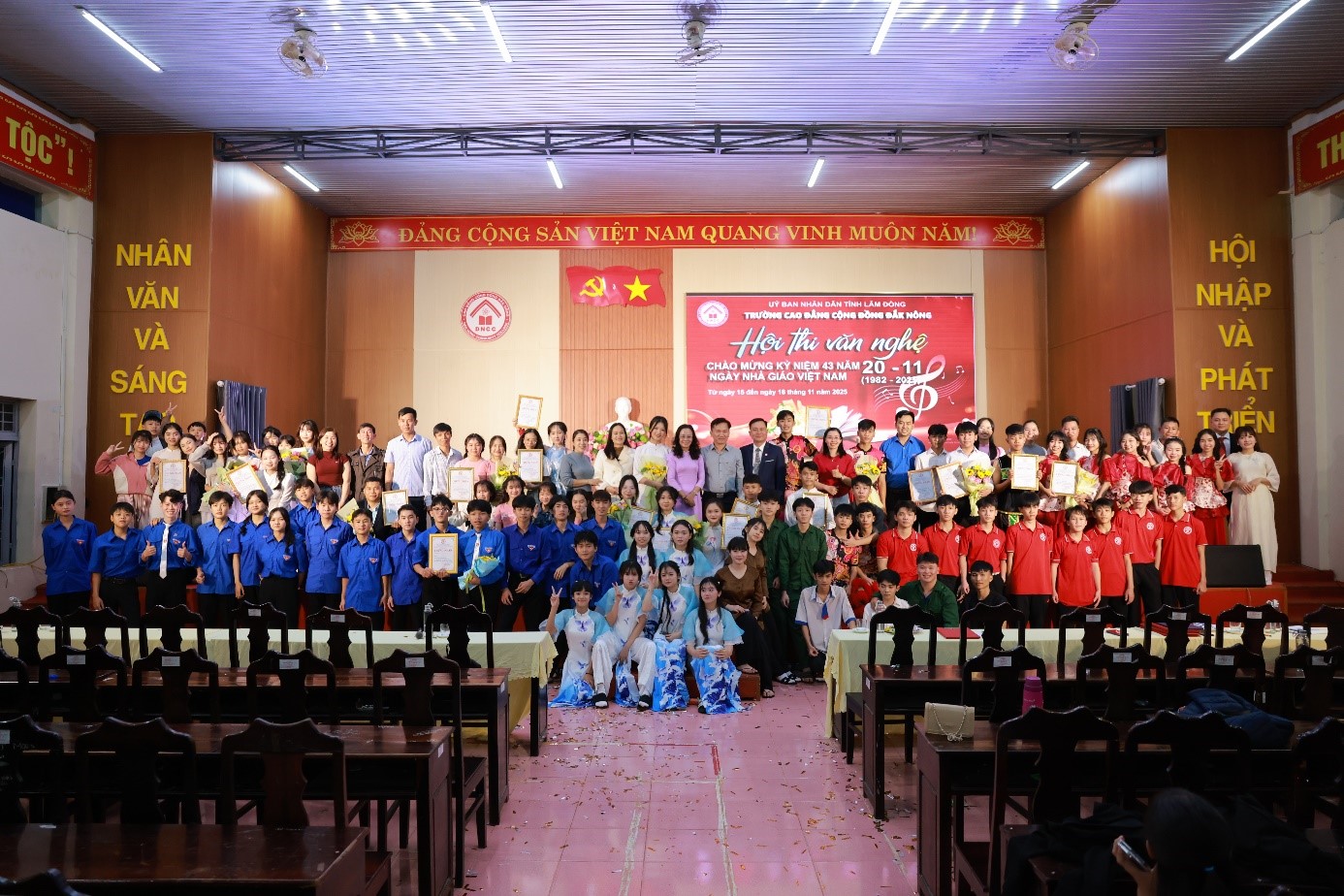 Hòa chung không khí hân hoan cả nước hướng tới Kỷ niệm 43 năm Ngày Nhà giáo Việt Nam (20/11/1982 - 20/11/2025). Tối ngày 17/11/2025, tại Nhà đa năng cơ sở 1 Trường Cao đẳng Cộng đồng Đắk Nông đã tổ chức thành công rực rỡ đêm chung kết Hội diễn Văn nghệ. Chương trình được xem là điểm nhấn nổi bật trong chuỗi hoạt động chào mừng ngày lễ lớn, thu hút sự quan tâm theo dõi của đông đảo cán bộ, giảng viên, học sinh, sinh viên và quý đại biểu.