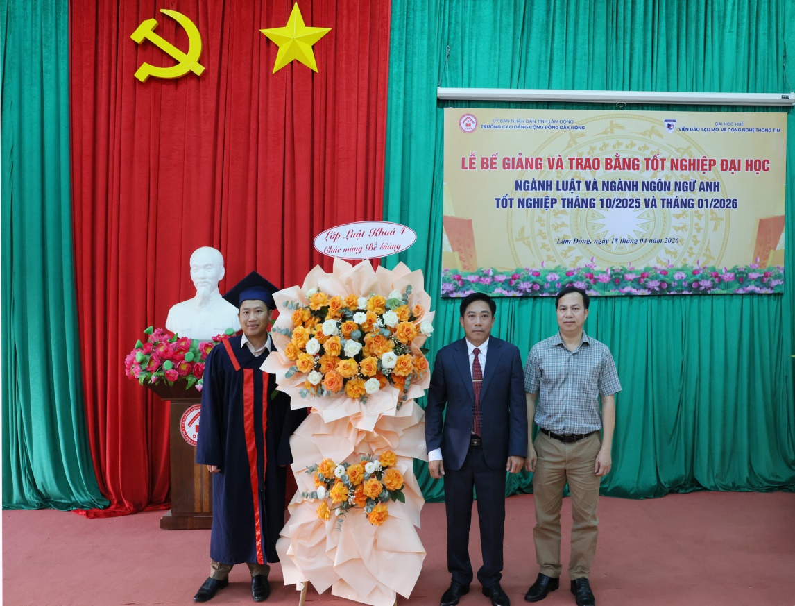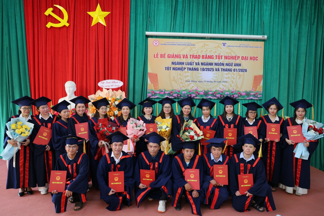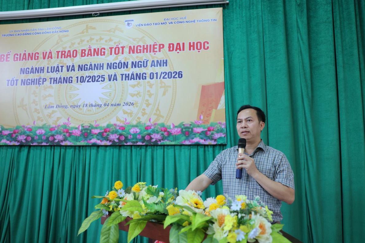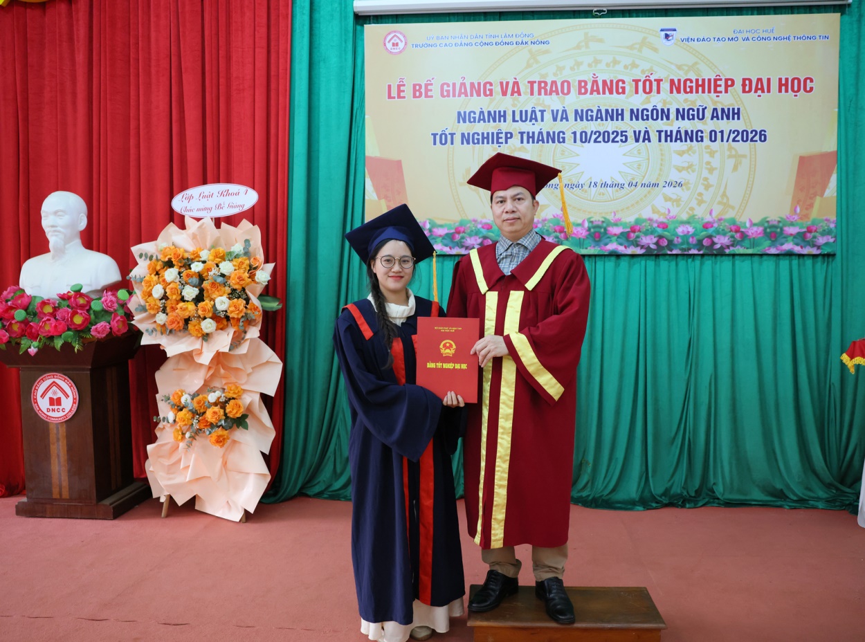 Ngày 18/4/2026, Viện Đào tạo Mở và Công nghệ thông tin - Đại học Huế phối hợp với Trường Cao đẳng Cộng đồng Đắk Nông long trọng tổ chức Lễ Bế giảng và trao bằng tốt nghiệp ngành Luật và Ngôn ngữ Anh (bằng đại học thứ 2) cho 40 tân cử nhân đã hoàn thành chương trình đào tạo.