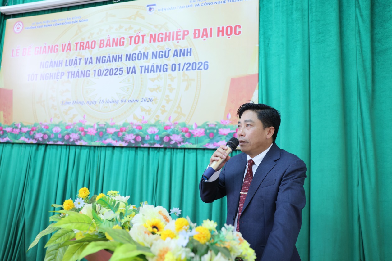Cũng tại buổi lễ, TS. Nguyễn Hữu Lành, Bí thư Đảng bộ, Trường Cao đẳng Cộng đồng Đắk Nông cảm ơn sự hợp tác bền vững của hai đơn vị, ghi nhận sự nỗ lực của các phòng, khoa đã tích cực phối hợp tổ chức, quản lý lớp học, biểu dương tinh thần học tập của các học viên, đồng thời thầy khẳng định: “Việc liên kết đào tạo đã mang lại cơ hội thiết thực cho người học tại địa phương; nhất là những người đang công tác nhưng vẫn mong muốn nâng cao tri thức, năng lực, trình độ chuyên môn và sẵn sàng thích ứng chuyển đổi nghề nghiệp. Đặc biệt, trong bối cảnh chuyển đổi số và bùng nổ công nghệ đã và đang dần thay đổi cấu trúc nghề nghiệp như hiện nay và chắc chắn sẽ còn thay đổi nhiều hơn nữa trong tương lai. Do vậy, những ai giữ được tinh thân học tập suốt đời, luôn tiếp cận tri thức và kỹ năng mới đó chính là chìa khóa để thích ứng và phát triển bền vững.”