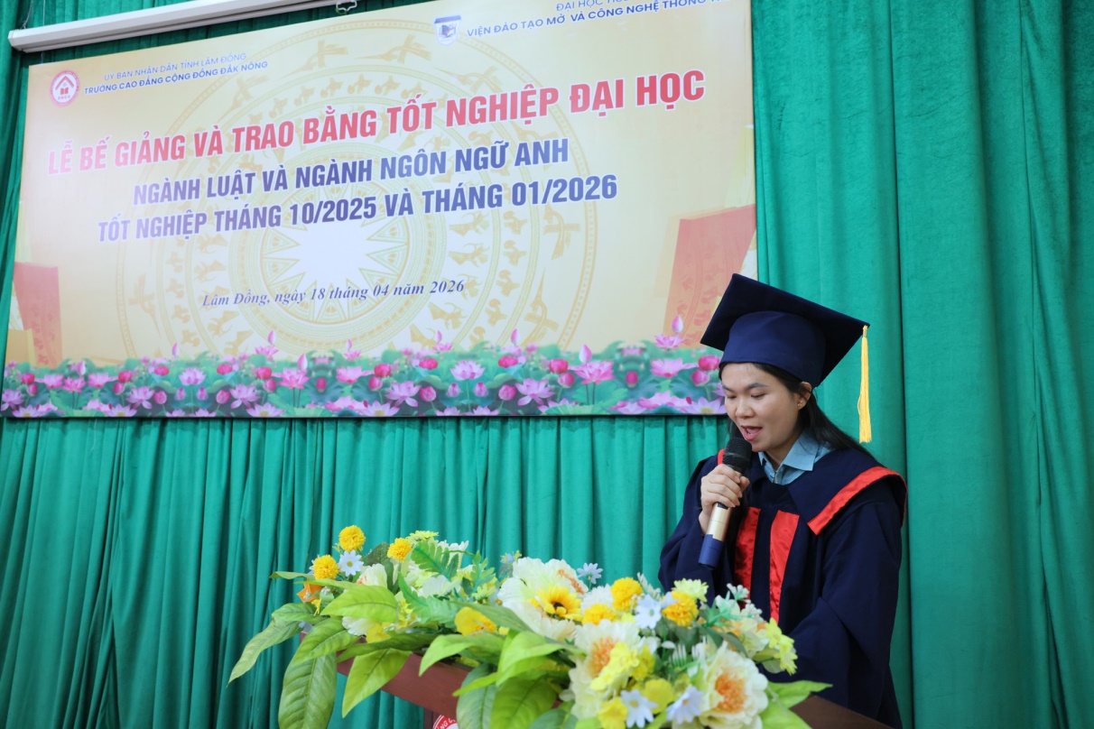 Trong niềm xúc động, hân hoan tân cử nhân ngành Luật, Trần Thị Tuyết Mai, đại diện các học viên tốt nghiệp cảm ơn sâu sắc tới các thầy cô, gia đình và cơ quan đã tạo điều kiện để các em hoàn thành khoá học, đổng thời chia sẻ: “Thời gian qua hai trường đã cho các em tiếp cận được môi trường học tập hiện đại, chương trình đào tạo mang đến những kiến thức chuyên môn vững chắc, kỹ năng thực tiễn và tư duy cập nhật với thời đại công nghệ 4.0. Đặc biệt, trường Cao đẳng Cộng đồng Đắk Nông đã giúp chúng em có được sự gần gũi, kịp thời ngay tại địa phương. Có thể nói hành trình học bằng đại học thứ 2 là những trải nghiệm đầy thử thách, nhưng cũng mang đến những niềm tự hào, hạnh phúc trong việc chinh phục tri thức; cơ hội để các em rèn luyện, thay đổi, thích ứng và phát triển sự nghiệp, phát triển bản thân trong thời kỳ mới.”